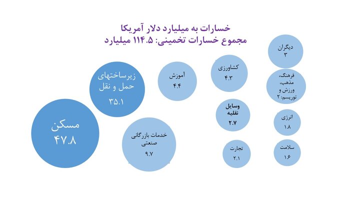 از این میزان، سهم خسارت به بخش مسکن ۴۷.۸ میلیارد دلار، زیرساخت‌های حمل ونقل ۳۵.۱، صنعت ۹.۷، آموزشی ۴.۴، کشاورزی ۴.۳، وسایل نقلیه ۲.۷، بخش تجاری ۲.۱، انرژی ۱.۸، سلامت ۱.۶، امور مرتبط با فرهنگ، مذهب، ورزش و تروریسم ۲ و سایر بخش‌ها ۳ میلیارد دلار برآورد شده‌ است.