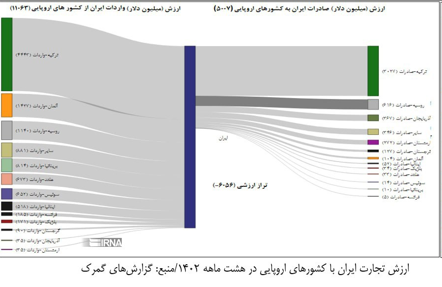 ارزش هر تن کالای وارداتی ایران از اروپا برابر با ۱۳۱۶ دلار بوده، در حالی که در هشت ماهه پارسال ارزش هر تن کالای وارداتی از اروپا ۱۲۴۲ دلار بود، یعنی کالای وارداتی از اروپا گرانتر شده است. تراز ارزشی ایران با کشورهای اروپایی منفی ۶۰۵۶ دلار و تراز وزنی مثبت ۱۶۱۴ دلار بوده؛ یعنی کالای وارداتی گران و کالای صارداتی ارزان بوده است.