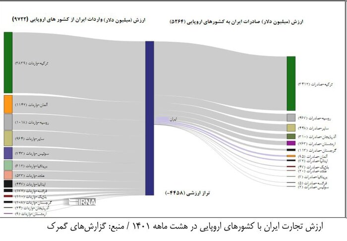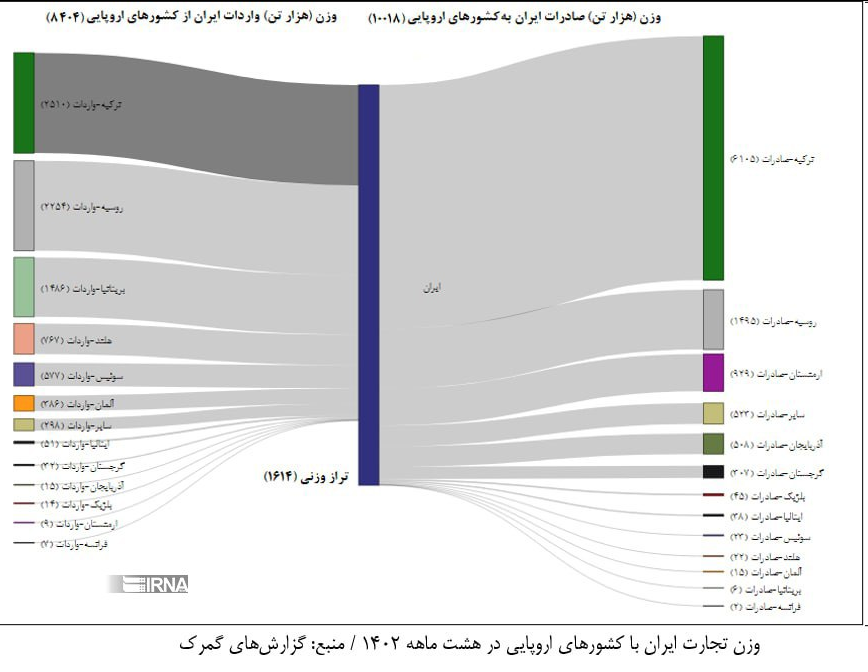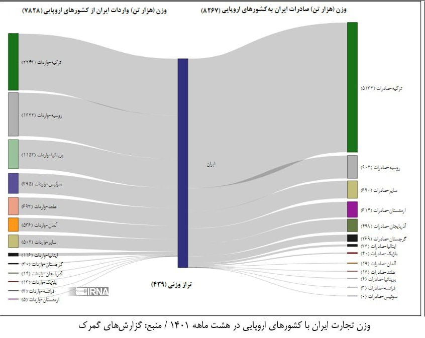ترکیه نخستین مقصد کالای ایرانی در اروپا در هشت ماهه ابتدایی امسال با ۶.۱ میلیون تن کالا به ارزش ۳ میلیارد دلار بوده که نشان از سهم ۶۰ درصدی ترکیه از مجموع صادراتی ایران به اروپاست و نسبت به مدت مشابه پارسال از نظر وزنی ۱۹ درصد افزایش و از نظر ارزشی ۱۱ درصد کاهش داشته است.