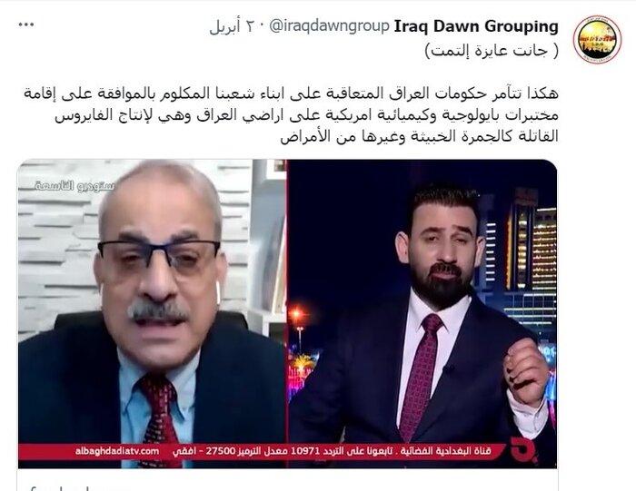 شبکه اجتماعی «قصص بغداد» نیز با انتشار نقشه آزمایشگاه های بیولوژیک آمریکا در دنیا، نوشته است که عراق یکی از اماکنی است که یکی از آزمایشگاه های بیولوژیک آمریکا در آن قرار دارد.