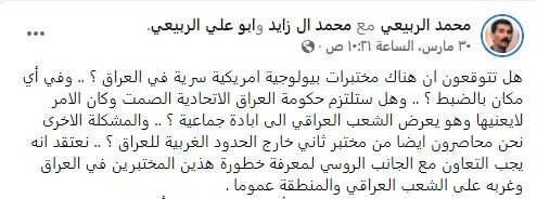 «ابو علی الربیعی» در صفحه شخصی خود ادامه داده است: چرا دولت عراق به گونه ای در قبال وجود و فعالیت این آزمایشگاه رفتار می کند که انگار به او ارتباطی ندارد.