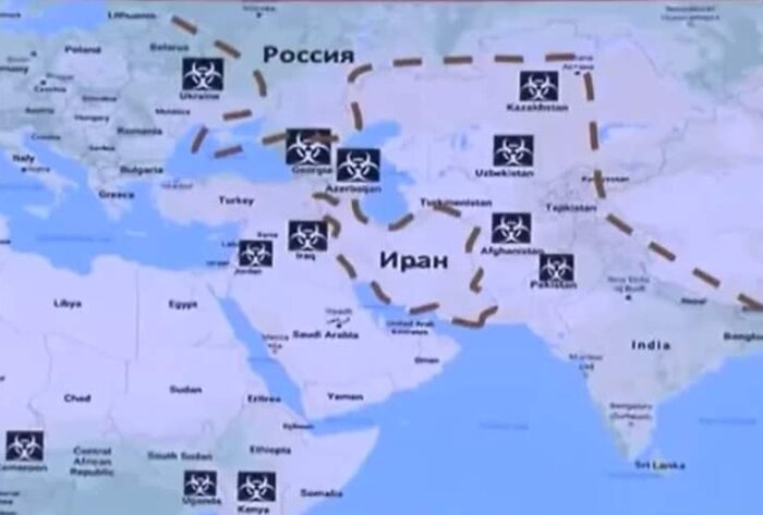 در این نقشه منتشر شده، جمهوری اسلامی ایران، تنها منطقه ای است که عاری از آزمایشگاه های بیولوژیک آمریکا است، در حالی که مناطق شرق، غرب و شمالی خارج از مرزهای ایران همگی با آزمایشگاه های بیولوژیک آمریکا احاطه شده اند.