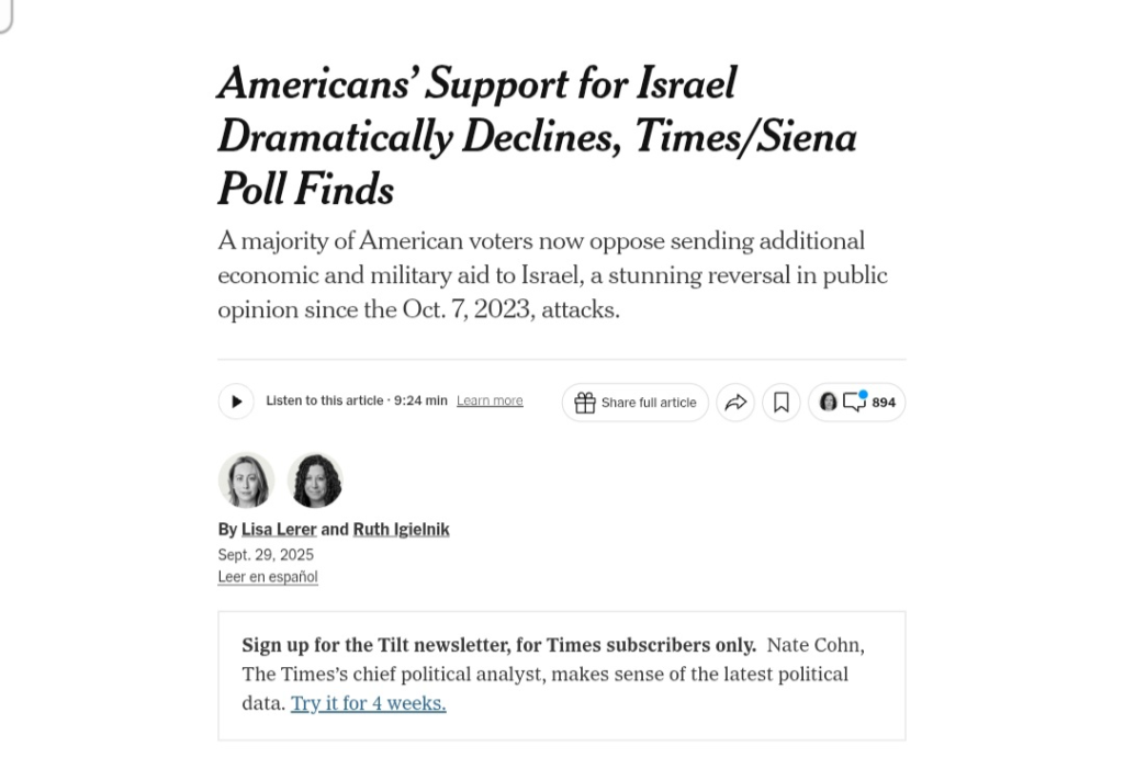 نظرسنجی نیویورک تایمز: حمایت آمریکاییها از اسرائیل شدیدا کاهش پیدا کرده، ۴۰ درصد میگویند اسرائیل عمداً غیرنظامیان را میکشد